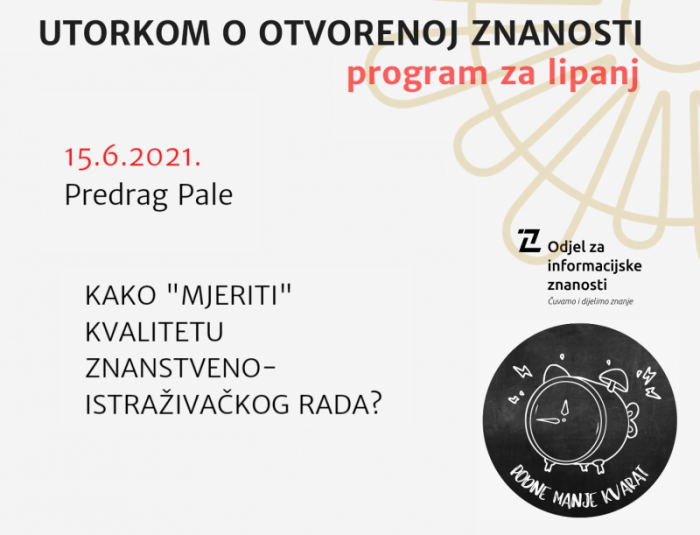 Posljednje iz serije predavanja Podne manje kvarat: Utorkom o otvorenoj znanosti održat će se 14. lipnja 2021. godine. Predavanje će izlagati Predrag Pale na temu: Kako “mjeriti” kvalitetu znanstveno-istraživačkog rada?